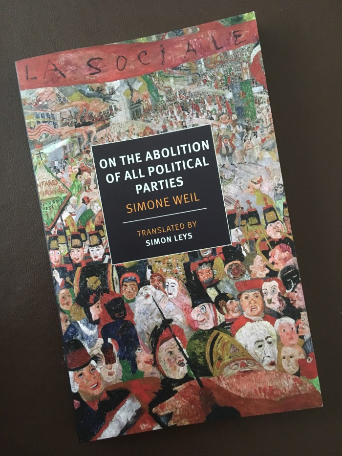 “Political parties are a marvellous mechanism which, on the national scale, ensures that not a single mind can attend to the effort of perceiving, in public affairs what is good, what is just, what is true.”